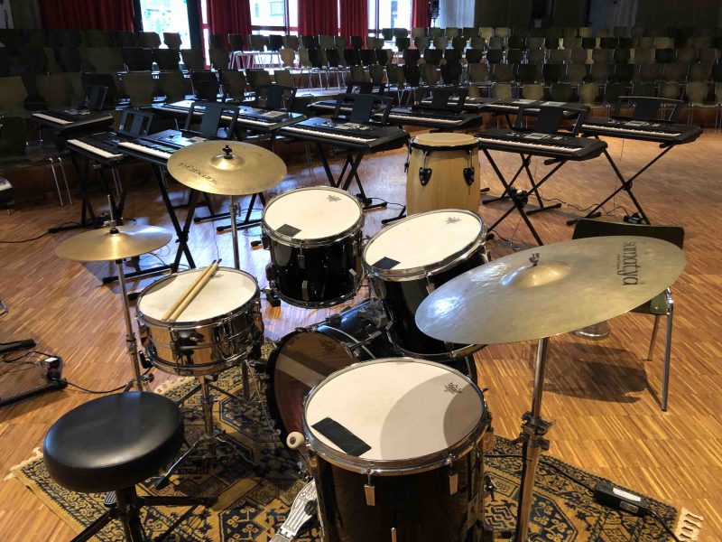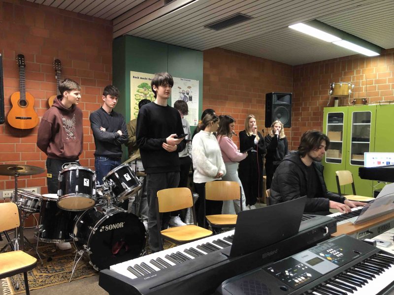 Das praktische Musizieren liegt der Fachschaft Musik somit besonders am Herzen und wird im Unterricht bewusst und kontinuierlich gestärkt. Dafür stehen unserer Schule sehr gut ausgestattete Fachräume zur Verfügung: Ein Keyboardraum mit mehreren Keyboards, Drumsets, E- und Bassgitarren, akustischen Gitarren sowie eine große Auswahl an Percussion-Instrumenten und unsere Schulaula ermöglichen vielfältige musikalische Arbeitsformen. Bandarbeit, gemeinsames Spielen und kreatives Experimentieren sind feste Bestandteile des Unterrichts.